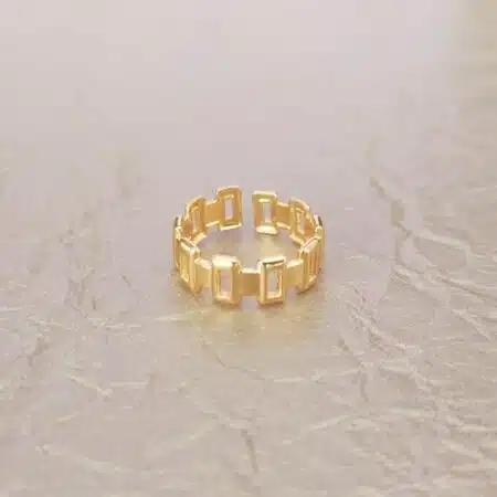 Cette bague en plaqué or, composée de petites briques rouges et blanches, capture l’esprit joyeux et éclatant d’une cerise juteuse. Chaque brique représente une goutte de bonheur et de vitalité, tandis que leur agencement rappelle l’effervescence des cerises dans un arbre généreux.